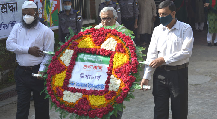 উপাচার্য প্রফেসর ড. অনুপম সেন শহীদ মিনারে পুষ্পমাল্য অর্পণ করার পর প্রিমিয়ার ইউনিভার্সিটির শিক্ষক-শিক্ষিকা ও কর্মকর্তা-কর্মচারিরা পুষ্পমাল্য অর্পণ করেন।