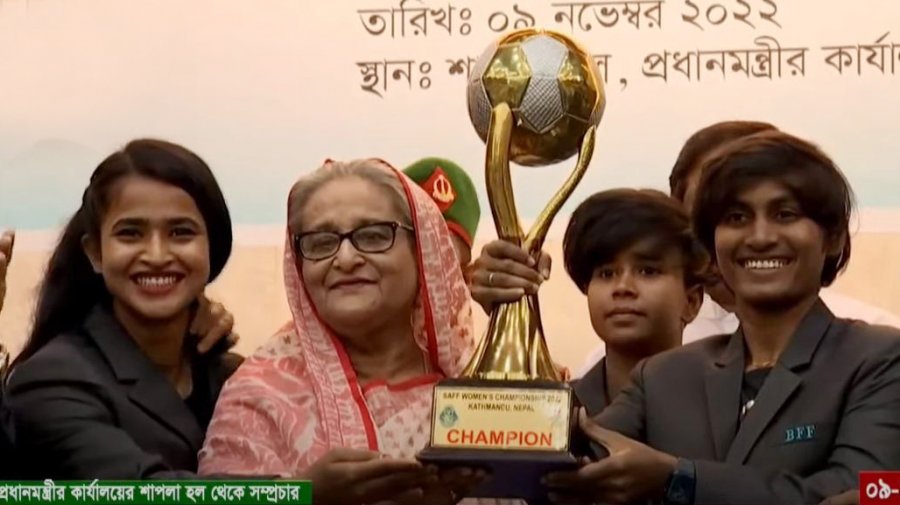গত সেপ্টেম্বরে সাফ নারী আসরের ফাইনালে নেপালকে ৩-১ গোলে হারিয়ে প্রথমবারের মতো চ্যাম্পিয়ন হয় বাংলাদেশ। সংবর্ধনা অনুষ্ঠানে সাফজয়ী খেলোয়াড়রা প্রধানমন্ত্রীর হাতে তাদের চ্যাপিম্পয়ন ট্রফি তুলে দেন।
