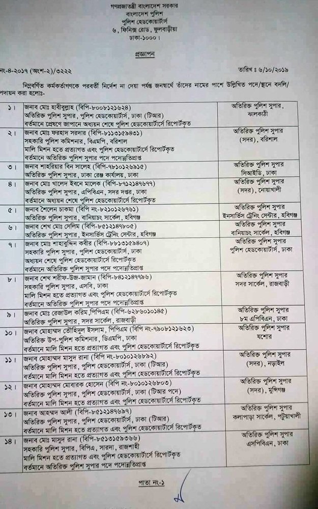 ৬ অক্টোবর, ২০১৯ পুলিশ হেডকোয়ার্টার্সের অতিরিক্ত ডিআইজি (পার্সোনেল ম্যানেজমেন্ট-১) মোঃ আমিনুল ইসলাম স্বাক্ষরিত এক প্রজ্ঞাপনে এ বদলী করা হয়।