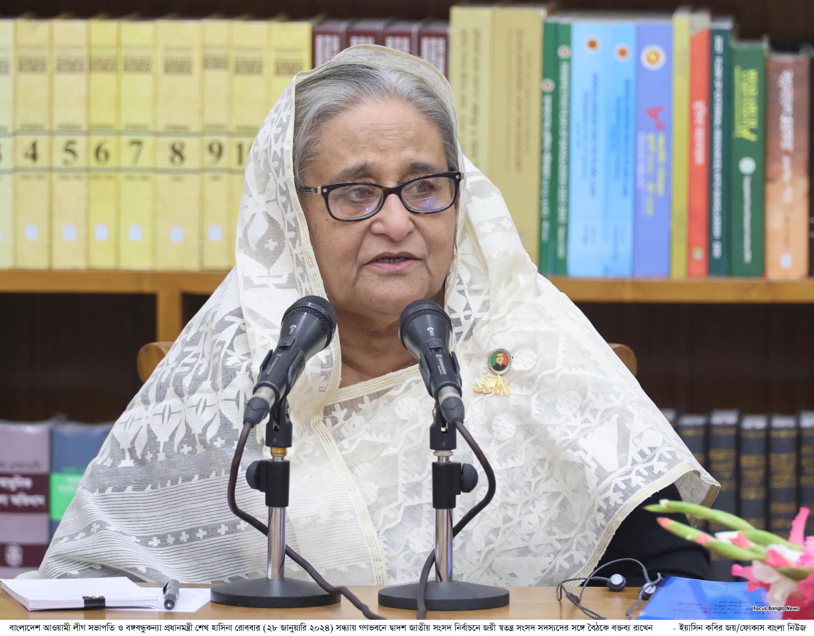 প্রধানমন্ত্রী বলেন, কিছু দেশীয় ও আন্তর্জাতিক পর্যায় থেকেও বলা হচ্ছে, নির্বাচন হয়েছে ঠিক, অবাধ ও সুষ্ঠু হয়নি। তাদের দেখাতে হবে কোথায় অবাধ সুষ্ঠু হয়নি? আমরা তো এতটুকু বলতে পারি, নির্বাচন অত্যন্ত অবাধ ও সুষ্ঠুভাবে হয়েছে। সব বাহিনী নিরপেক্ষভাবে তাদের দায়িত্ব পালন করেছে। অনেকে চেয়েছে, নির্বাচন অবাধ ও সুষ্ঠু না হোক, তাতে প্রশ্নবিদ্ধ করা যাবে এবং স্যাংশন দেওয়া যাবে। স্যাংশন নিয়ে আমি বলেছিলাম, আমরাও স্যাংশন দিতে পারি। না জেনে বলি না। আমি স্যাংশনের সব জানি বলেই বলেছি।