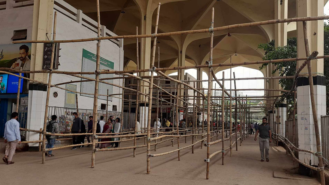 রোববার (২৪ মার্চ) ঢাকা রেলওয়ে স্টেশন সরেজমিনে ঘুরে দেখা যায়, গতবারের মতো এবারও বাঁশের এই অস্থায়ী পথ তৈরি করা হচ্ছে। পাঁচটি পথ রয়েছে এই অস্থায়ী পথ। প্রথম পথটি গিয়ে মিলেছে কাউন্টারের সামনে। যেখান থেকে যাত্রীরা ট্রেন ঢাকা স্টেশন ছেড়ে দেওয়ার আগে স্ট্যান্ডিং টিকিট কিনতে পারবেন। তারপরের তিনটি পথ দিয়ে মূলত যাত্রীদের প্রবেশ করতে হবে স্টেশন অংশে। আর পঞ্চম পথটি তৈরি করা হয়েছে, যেসব যাত্রী ট্রেন থেকে নেমে ঢাকায় প্রবেশ করবেন তাদের জন্য।