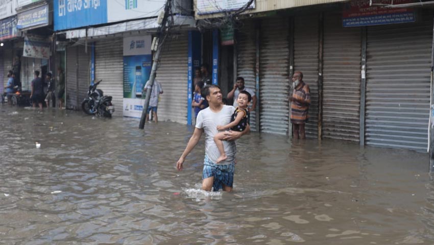 ভারী বৃষ্টিতে তলিয়ে গেছে রাজধানী ঢাকার অধিকাংশ রাস্তাঘাট। শুক্রবার (১২ জুলাই) ভোর রাত থেকে শুরু হওয়া এই বৃষ্টি হয় টানা কয়েক ঘণ্টা। এতে রাজধানীর প্রধান সড়কগুলো ছাড়াও অলিগলির অধিকাংশ রাস্তা হাঁটু থেকে কোমর পর্যন্ত এমনকি কোথাও কোথাও গলা সমান পানিতে নিমজ্জিত হয়েছে।