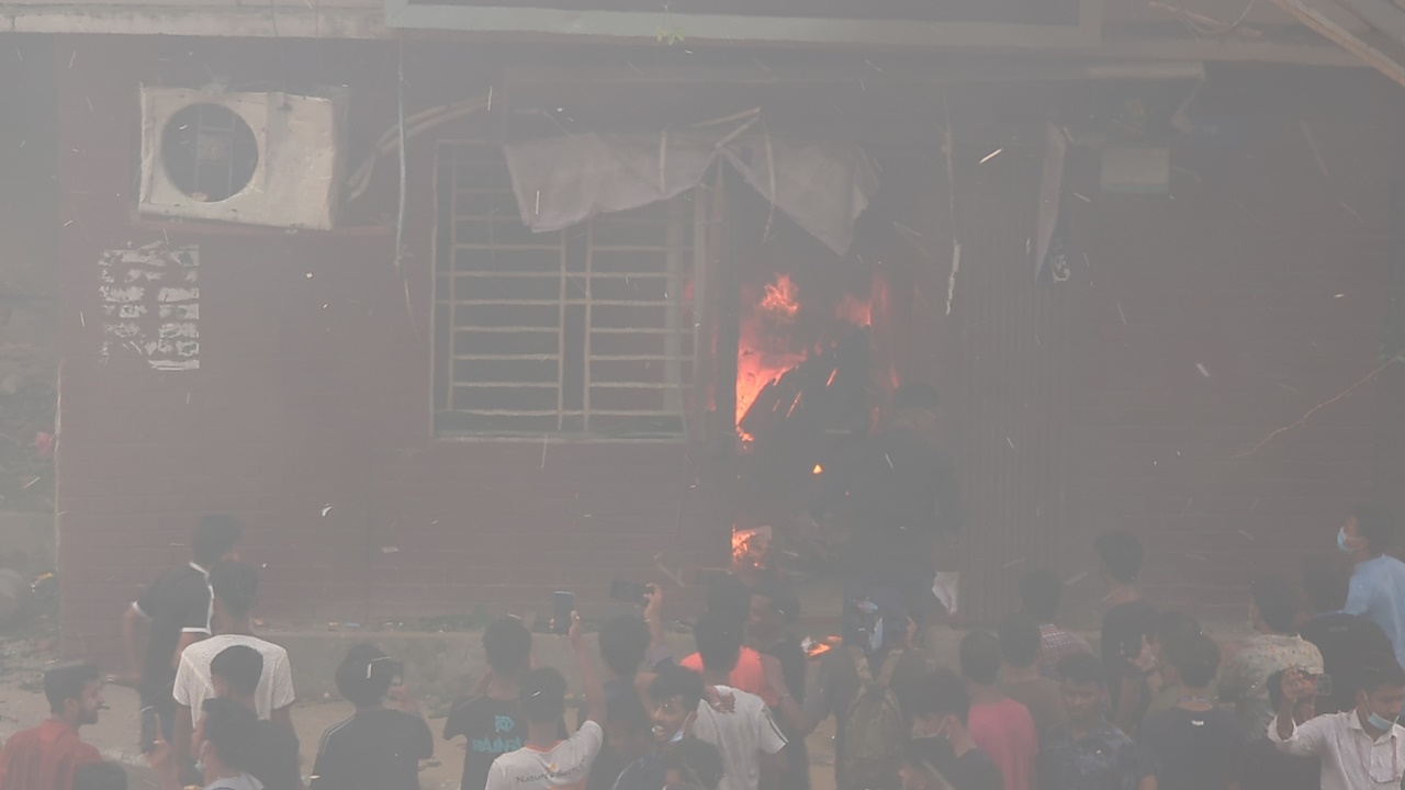 পরে বিক্ষুব্ধ শিক্ষার্থীরা পুলিশ বক্সে আগুন ধরিয়ে দেন। এই মুহূর্তেই পুরো এলাকাজুড়ে থমথমে পরিস্থিতি বিরাজ করছে