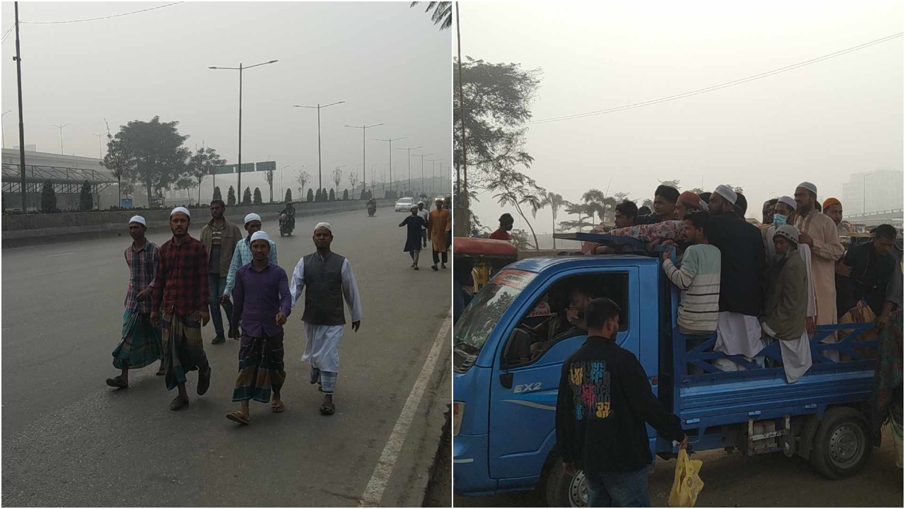 যদিও ঘন কুয়াশায় মোড়ানো রয়েছে রাজধানী ঢাকা। কুয়াশার ঘনত্ব বেশি হওয়ায় একটু দূরের জিনিস দেখতে বেগ পেতে হচ্ছে। তবুও ইজতেমা উপলক্ষ্যে সড়কে গণপরিবহন বন্ধ থাকায় হেঁটেই তুরাগ তীরের দিকে যাচ্ছেন মুসল্লিরা। আবার মাঝে মাঝে এখান ওখান থেকে পিকআপ এসে উপস্থিত হয়ে ৫০/১০০ টাকার বিনিময়ে কিছুটা পথ এগিয়ে দিয়ে আসছেন মুসল্লিদের।