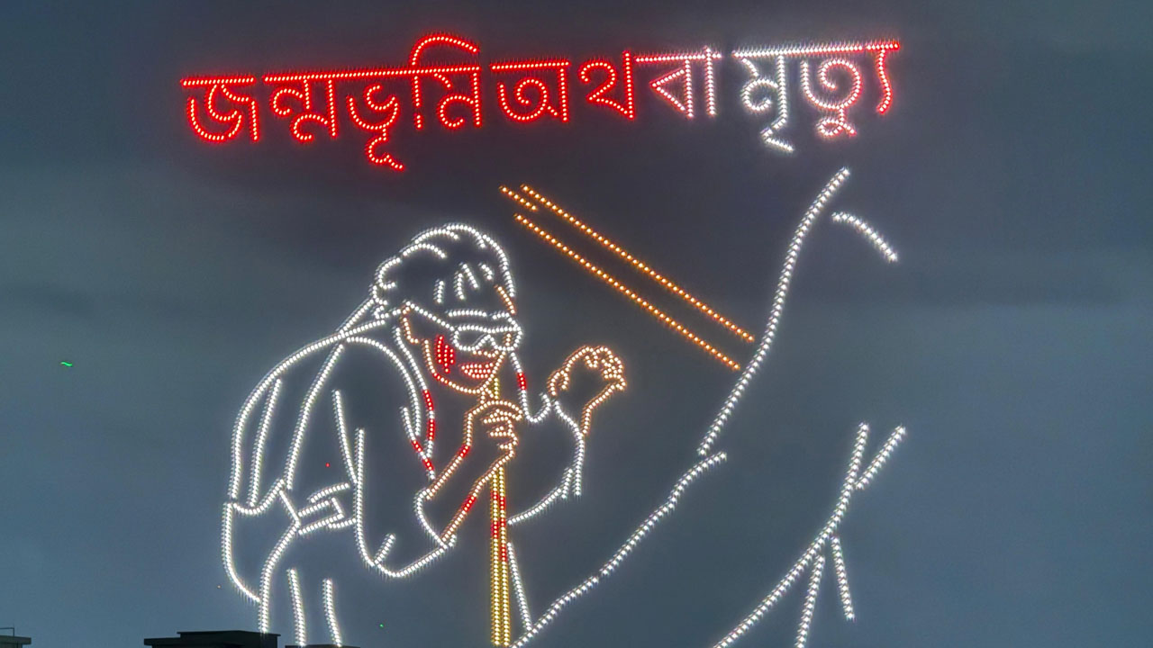 ঢাকা বিশ্ববিদ্যালয় সংলগ্ন কেন্দ্রীয় শহীদ মিনারে আয়োজন করা হয় এ ব্যতিক্রমধর্মী আয়োজনের। শতাধিক ড্রোন আবারও ফুটিয়ে তুললো চব্বিশের জুলাইয়ের সাহসী, বিপ্লবী অবদান। ঢাকা বিশ্ববিদ্যালয়ের শিক্ষার্থীরা বিমোহিত দৃষ্টিতে তা দেখেন।