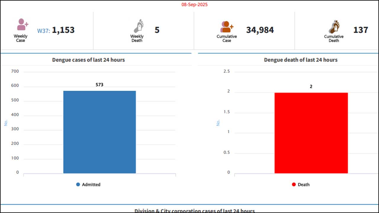 চলতি বছরের ১ জানুয়ারি থেকে ৬ সেপ্টেম্বর পর্যন্ত ডেঙ্গুতে মৃতের সংখ্যা বেড়ে ১৩৭ জন এবং শনাক্ত রোগী বেড়ে দাঁড়িয়েছে ৩৪ হাজার ৯৪৮ জনে।