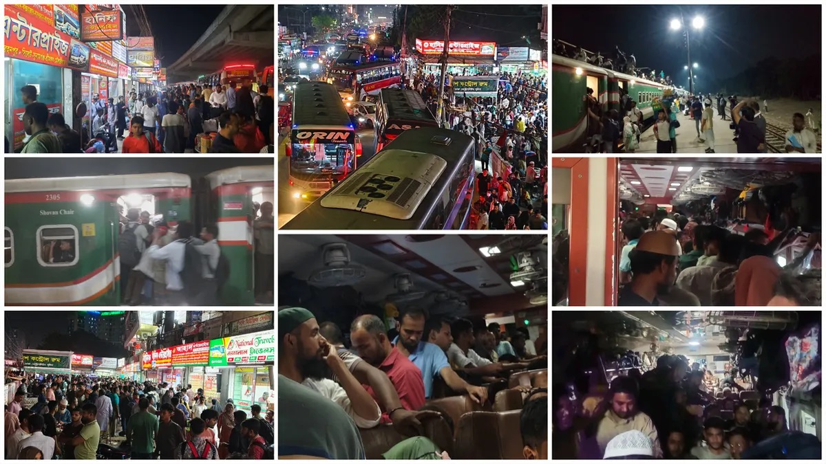 ঢাকা পোস্টের নিজস্ব প্রতিবেদক মেহেদি হাসান সজল জানান, দেশের প্রধান ঢাকা রেলওয়ে স্টেশন ঘুরে দেখা গেছে— রাত ৮টায় লালমনি, রংপুর, কুড়িগ্রাম ও বুড়িমারীর উদ্দেশে কুড়িগ্রাম এক্সপ্রেস ছেড়ে গেছে। উত্তরাঞ্চলের উদ্দেশে যাত্রা করা এই ট্রেনে ঠেসে ঠেসে চড়ে গন্তব্যে ছুটছেন ঘরমুখো মানুষ। যাত্রীদের চাপে অতিরিক্ত কোচ যুক্ত করা হলেও অনেকেই টিকিট নিয়ে নিজ কোচের আসনে গিয়ে বসতে পারেননি। অনেককে কোচের দরজায় ঝুলে ঝুলে যেতে দেখা গেছে।