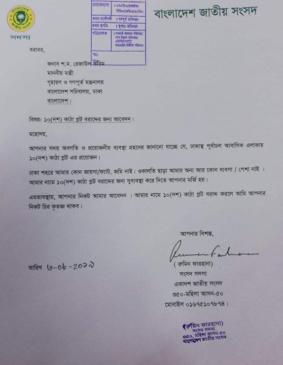 আবেদনে ব্যারিস্টার রুমিন ফারহানা লিখেছেন, ঢাকা শহরে আমার কোন জায়গা /ফ্লাট, জমি নাই। ওকালতি ছাড়া আমার অন্য আর কোন ব্যবসা/ পেশা নাই। আমার নামে ১০ (দশ) কাঠা প্লট বরাদ্দের জন্য সুব্যবস্থা করে দিতে আপনার মর্জি হয়।