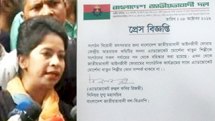 এতে বলা হয়, দলীয় শৃঙ্খলা ভঙের জন্য বাংলাদেশ জাতীয়তাবাদী আইনজীবী ফোরাম কেন্দ্রীয় আহ্বায়ক কমিটির সদস্য অ্যাডভোকেট মোর্শেদা খাতুন শিল্পীকে সংগঠনের সব পর্যায়ের পদ থেকে বহিষ্কার করা হয়েছে। এখন থেকে আইনজীবী ফোরামের সাংগঠনিক কার্যক্রমের সঙ্গে তার কোনও সম্পর্ক থাকবে না।