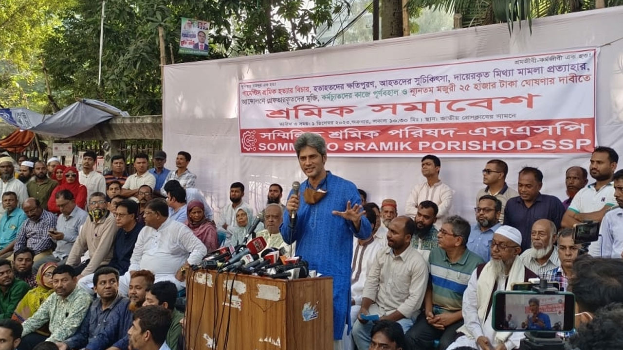 শুক্রবার (১ ডিসেম্বর) দুপুরে জাতীয় প্রেস ক্লাবের সামনে সম্মিলিত শ্রমিক পরিষদ (এসএসপি) আয়োজিত এক বিক্ষোভ সমাবেশে তিনি এসব কথা বলেন। শ্রমিক হত্যার বিচার ও ক্ষতিপূরণ, আহতদের চিকিৎসা ও ক্ষতিপূরণ, কর্মচ্যুতদের পুনর্বহাল, গ্রেপ্তারকৃতদের মুক্তি, গার্মেন্টস শিল্প ঘোষিত মজুরি প্রস্তাব প্রত্যাহার এবং ন্যূনতম মজুরি ২৫ হাজার টাকা পুনর্নির্ধারণের দাবিতে এই সমাবেশের আয়োজন করা হয়।