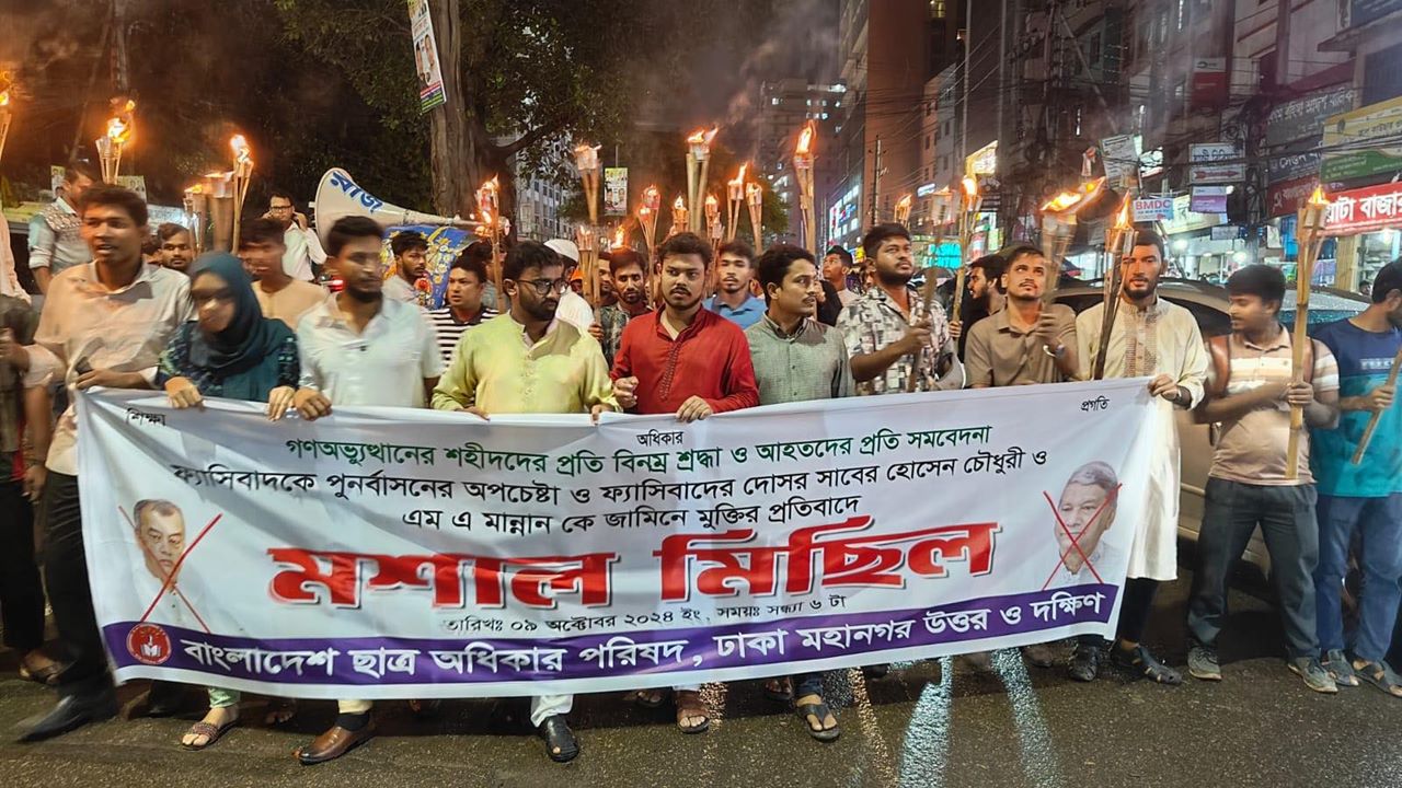 আওয়ামী লীগ নেতা ও সাবেক পরিকল্পনা মন্ত্রী এম এ মান্নান এবং সাবেক বন ও পরিবেশমন্ত্রী সাবের হোসেন চৌধুরীর জামিনের প্রতিবাদে মশাল মিছিল করেছে ছাত্র অধিকার পরিষদ ঢাকা উত্তর ও দক্ষিণ।