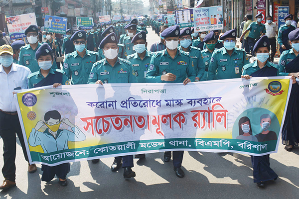 করোনার দ্বিতীয় দফা প্রকোপ ঠেকাতে জনসচেতনতা সৃষ্টির লক্ষে বরিশালে বর্ণাঢ্য র্যালি করেছে পুলিশ। এ সময় জনসাধারণের মাঝে মাস্ক ও সচেতনতামূলক লিফলেট বিতরণ করেন পুলিশ কমিশনার।