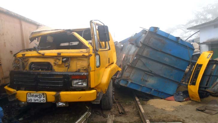 দিনাজপুরের ফুলবাড়ীতে পণ্যবাহী ট্রেন ও ট্রাকের সংঘর্ষে একজন নিহত হয়েছে। এ ঘটনায় অল্পের জন্য রক্ষা পেল স্টেশনে দাঁড়িয়ে থাকা যাত্রীবাহী খুলনা এক্সপ্রেসটি (রকেট মেইল)। ৫ ঘণ্টা পর সচল হয়েছে ট্রেন চলাচল।
