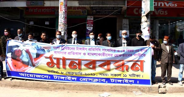 মানববন্ধনে বক্তব্য রাখেন টাঙ্গাইল প্রেসক্লাবের সভাপতি জাফর আহমেদ, সাধারণ সম্পাদক কাজী জাকেরুল মওলা, সহ-সভাপতি তুহিন খান, নিউ এজের জেলা প্রতিনিধি হাবিব খান, একুশে টিভির জেলা প্রতিনিধি কাজী তাজ উদ্দিন রিপন, আব্দুল গনি আল রুহী, যমুনা টেলিভিশনের জেলা প্রতিনিধি শামীম আল মামুন ও ডিবিসি চ্যানেলের জেলা প্রতিনিধি সোহেল তালুকদার প্রমুখ।