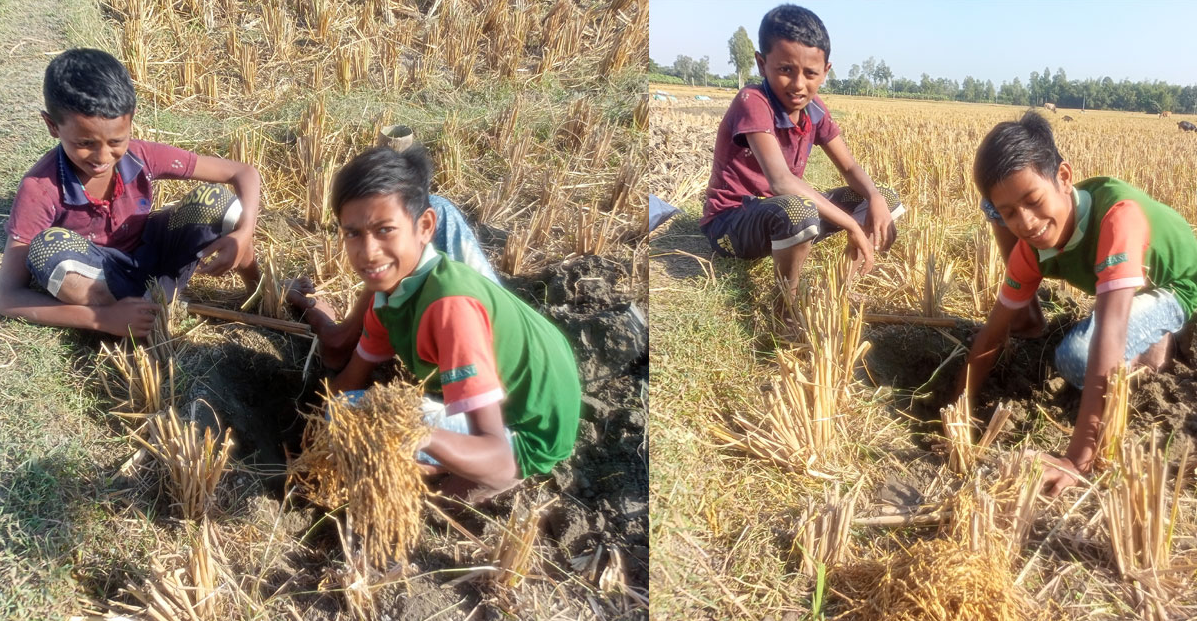 নিজস্ব প্রতিবেদক: চারদিকে ফসলের মাঠ। আমন ধান ঘরে তুলতে ব্যস্ত সময় পার করছেন কৃষাণ-কৃষাণীরা। নতুন ফসলে ভরে উঠেছে বাড়ির উঠানসহ মাঠ-ঘাট। কৃষকরা যখন ফসল ঘরে নিয়ে যেতে ব্যস্ত, তখন ইঁদুরের গর্ত থেকে ধান বের করতে ব্যস্ত বায়েজিদ (৭) ও আলমগীর (১২) নামে দুই শিশু। গর্তে পাওয়া ধান বেচে শীতের কাপড় কেনার ইচ্ছা তাদের।