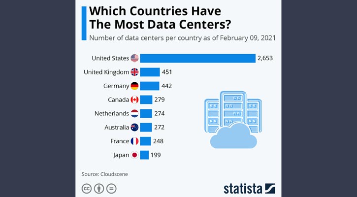 তথ্য কেনা-বেচার অনলাইন মার্কেটপ্লেস ক্লাউডসিন প্ল্যাটফর্মের বরাতে জার্মানি ভিত্তিক গবেষণা প্রতিষ্ঠান স্ট্যাটিস্টা সম্প্রতি বিশ্বের বিভিন্ন দেশের ডাটা সেন্টারের সংখ্যা প্রকাশ করে। তবে এই তালিকায় কোনো সরকারি ব্যবস্থাপনায় থাকা ডাটা সেন্টারকে হিসাবে রাখা হয়নি। শুধু ব্যক্তি মালিকানায় পরিচালিত ডাটা সেন্টারগুলোকেই তালিকায় রাখা হয়েছে।