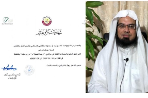 সম্প্রতি কাতার ইসলামিক কালচারাল সেন্টারের দাওয়াহ বিভাগের অন্যতম সুপারভাইজার শাইখ শাউর আহমদ আল আজহারী মাওলানা ইউসুফ নূরের হাতে এ সম্মাননাপত্র ও উপহার তুলে দেন।