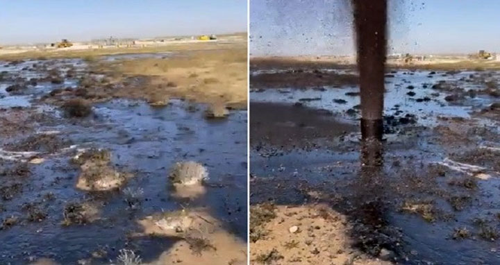 সামাজিক যোগাযোগমাধ্যমে ছড়িয়ে পড়া ভিডিওতে দেখা গেছে, একটি অনাবাদি জমিতে পাইপলাইন থেকে তেলে উছলে পড়ছে।