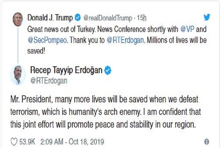 সিরিয়ায় কুর্দিবিরোধী অভিযানে যুদ্ধবিরতিতে সম্মত হওয়ায় তুরস্ককে নিয়ে ট্রাম্পের ধন্যবাদ সূচক মন্তব্যের জবাব দিয়েছেন তুর্কি প্রেসিডেন্ট রিসেপ তায়েপ এরদোয়ান। যুদ্ধবিরতির ঘোষণার পর মার্কিন প্রেসিডেন্ট ডোনাল্ড ট্রাম্প এক টুইটে তুর্কি প্রেসিডেন্টকে ধন্যবাদ জানিয়ে বলেন, ‘এতে করে অনেক মানুষের জীবন বাঁচবে।’ এই টুইটের জবাবে এরদোয়ান বলেন, অনেক মানুষ তখনই বাঁচবে যখন আমরা সন্ত্রাসকে নির্মূল করতে পারবো।