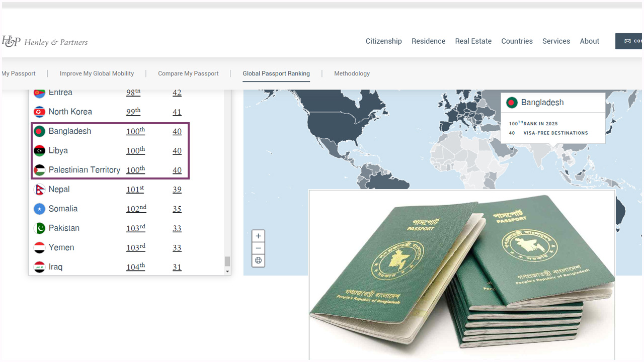 যুক্তরাজ্যভিত্তিক পরামর্শক প্রতিষ্ঠান ‘হ্যানলি অ্যান্ড পার্টনার্সের’ করা বিশ্বের সবেচেয়ে শক্তিশালী পাসপোর্ট সূচকে গত বছরের তুলনায় ২০২৫ সালে বাংলাদেশের অবস্থানের অবনতি ঘটেছে। ২০২৪ সালে এই সূচকে শক্তিশালী পাসপোর্টের তালিকায় বাংলাদেশ ৯৭তম অবস্থানে থাকলেও এ বছর ১০০তম স্থানে নেমে গেছে।