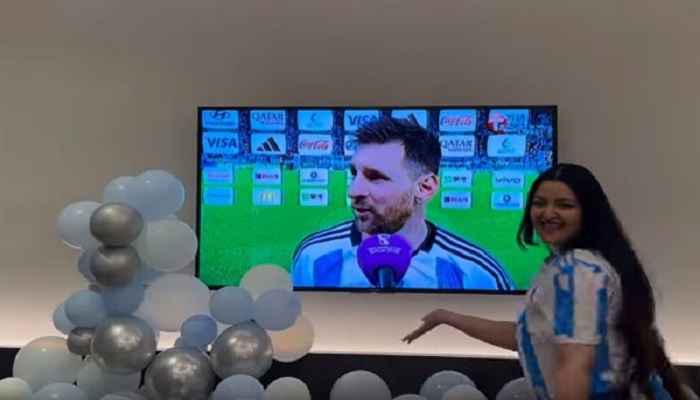 ভিডিওতে দেখা যায়, খেলা শেষে সাংবাদিকের সঙ্গে প্রতিক্রিয়া জানাতে কথা বলছেন মেসি। টিভিতে সেই দৃশ্য দেখে মেসিকে 'ফ্লাইং কিস' দিচ্ছেন 'স্বপ্নবাজ' নায়িকা।