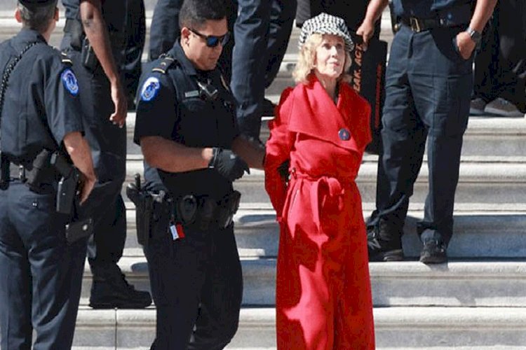সেখানে দেখা গেছে, উজ্জ্বল লাল রঙের ওভারকোট পরে বিক্ষোভে অংশ নেন জেন ফন্ডা। বিক্ষোভে তাকে জলবায়ু পরিবর্তনের বিরুদ্ধে স্লোগান দিতে দেখা গেছে। একপর্যায়ে তার দুহাতে হ্যান্ডকাফ পরিয়ে বিক্ষোভরতদের কাছ থেকে তাকে দূরে সরিয়ে নেয় পুলিশরা।
