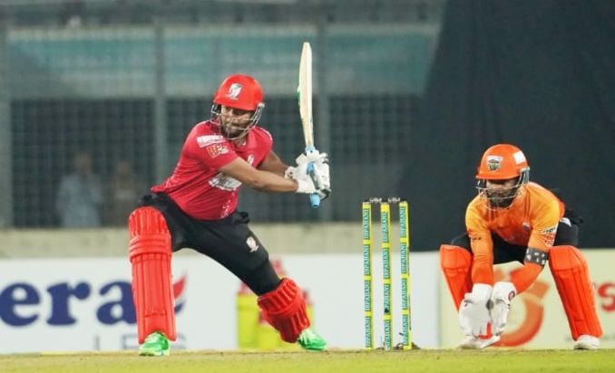 সাকিব ১৪ বলে ১টি চার ও ২টি ছয়ে ২২ রান করেন তিনি। রানের তাড়নায় বড় শট খেলতে গিয়ে সাকিব আউট হয়ে ফিরলে মনে হয় রান আটকে যাবে বরিশালের। কিন্তু সেখান থেকে ডোয়াইন প্রিটোরিয়াস এবং ইব্রাহিম জাদরানের ব্যাটে ভর করে বড় সংগ্রহ পায় বরিশাল।