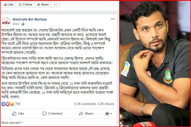মাশরাফি আরো লেখেন, ‘তবে আমার উপস্থিত থাকা কিংবা না থাকার চেয়ে, ১১ দফা দাবি বাস্তবায়িত হওয়াই বড় কথা। সবকটি দাবিই ন্যায্য, ক্রিকেট ও ক্রিকেটারদের মঙ্গলের জন্য জরুরি। আমি মাশরাফি বিন মোর্ত্তজা, ১১ দফা দাবি শান্তিপূর্ণভাবে বাস্তবায়িত হওয়ার পক্ষে আছি, থাকব।’