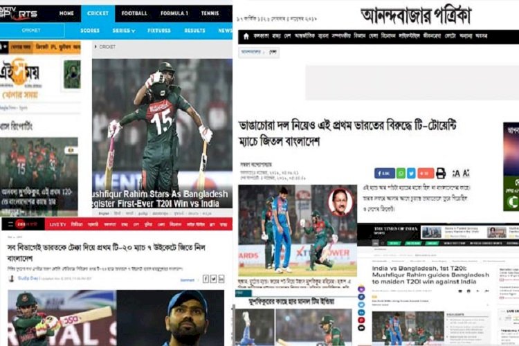 ‘এনডিটিভি’ অনলাইন মুশফিকুর রহিম ও মাহমুদউল্লাহ রিয়াদের আলিঙ্গনের ছবি দিয়ে শিরোনাম করেছে, ‘Mushfiqur Rahim Stars As Bangladesh Register First-Ever T20I Win vs India’ (ভারতের বিপক্ষে বাংলাদেশের প্রথম টি-টোয়েন্টি জয়ের নায়ক মুশফিকুর রহিম।’