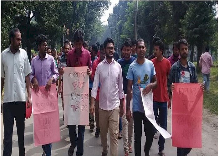 সোমবার (৭ অক্টোবর) দুপুর দেড়টায় বিশ্ববিদ্যালয়ের শহীদ মিনার সংলগ্ন সড়কে মানববন্ধন অনুষ্ঠিত হয়। এতে বিভিন্ন ছাত্র সংগঠনের নেতাকর্মীরা উপস্থিত হন। মানববন্ধনে বিশ্ববিদ্যালয়ের বিভিন্ন বিভাগের আওয়ামী লীগ, বিএনপি ও বামপন্থী বেশ কয়েকজন শিক্ষক যোগ দেন। পরে একটি বিক্ষোভ মিছিল বের করেন তারা।