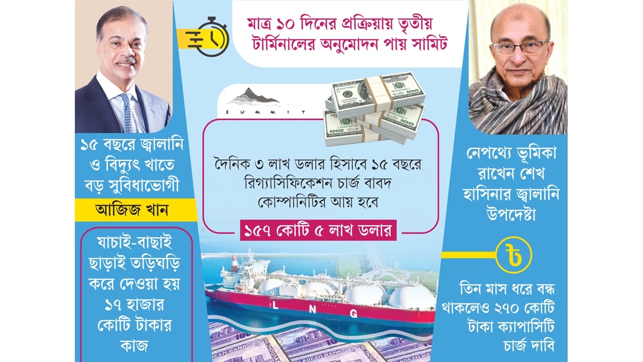 ক্ষমতাচ্যুত আওয়ামী লীগ সরকারের আমলে প্রধানমন্ত্রীর কার্যালয়ের এক বৈঠকেই বাজিমাত করেছিল বিদ্যুৎ ও জ্বালানি খাতের আলোচিত কোম্পানি সামিট। কোনো ধরনের প্রতিযোগিতা ও যাচাই-বাছাই ছাড়াই ওই বৈঠকে প্রতিষ্ঠানটিকে ১৭ হাজার কোটি টাকার এলএনজি টার্মিনালের কাজ দেওয়া হয়। মাত্র ১০ দিনের প্রক্রিয়ায় তৎকালীন প্রধানমন্ত্রীর জ্বালানি উপদেষ্টা ড. তৌফিক-ই-ইলাহী চৌধুরীর একক সিদ্ধান্ত ও চাপে সামিটকে এই কাজ দেওয়া হয়। এজন্য জ্বালানি ও বিদ্যুৎ খাতের বিশেষ আইন কাজে লাগানো হয়। জ্বালানি বিভাগ সূত্রে এ তথ্য জানা গেছে।