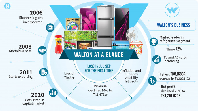 ২০২২-২৩ অর্থবছরের প্রথম প্রান্তিকে ওয়ালটনের ৪৬ কোটি টাকা লোকসান হয়েছে এবং ২৮০.৯৮ কোটি টাকা মুনাফা থেকে শেয়ার প্রতি আয় ১.৫২ টাকায় নেমে এসেছে; গত বছর একই সময়ে শেয়ার প্রতি আয় বৃদ্ধি পায় ৯.২৮ টাকা।