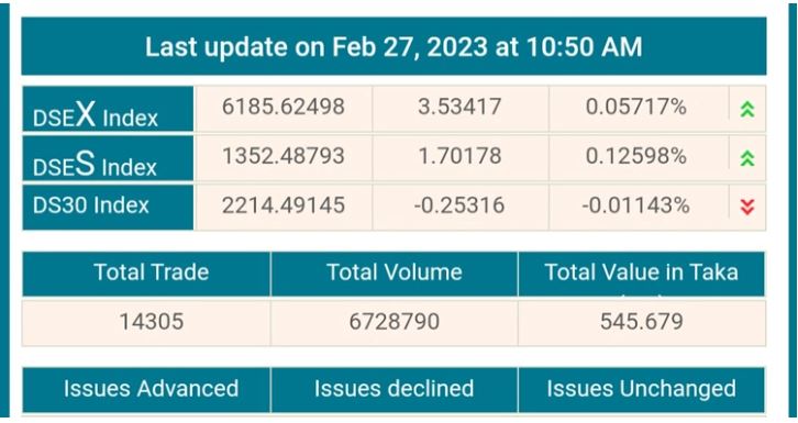 এরপরও ডিএসই’র প্রধান সূচক বেড়েছে ৩ পয়েন্ট। অপর দুই সূচকের মধ্যে ডিএসই-৩০ সূচক কমেছে দশমিক ২৫ পয়েন্ট। আর ডিএসই শরিয়াহ্ সূচক বেড়েছে ১ পয়েন্ট। এ সময় পর্যন্ত ডিএসইতে লেনদেন হয়েছে ৫৪ কোটি ৫৬ লাখ টাকা।