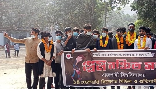 বিশ্ব ভালোবাসা দিবসে সারাবিশ্ব যখন ভালোবাসায় মগ্ন, তখন ‘প্রেমের দাবিতে’ রাজশাহী বিশ্ববিদ্যালয়ে (রাবি) বিক্ষোভ মিছিল করেছে প্রেমবঞ্চিত সংঘ।
