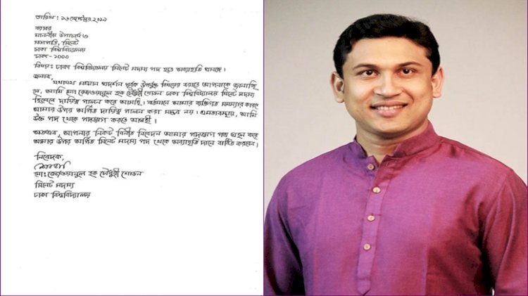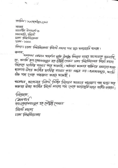 সদ্য সাবেক সভাপতি রেজওয়ানুল হক চৌধুরী শোভন ঢাকা বিশ্ববিদ্যালয়ের সিনেট থেকে পদত্যাগ করেছেন। এবিষয়ে আজ বিশ্ববিদ্যালয়ের উপাচার্য ড. আখতারুজ্জামানের কাছে চিঠি দিয়েছেন তিনি।