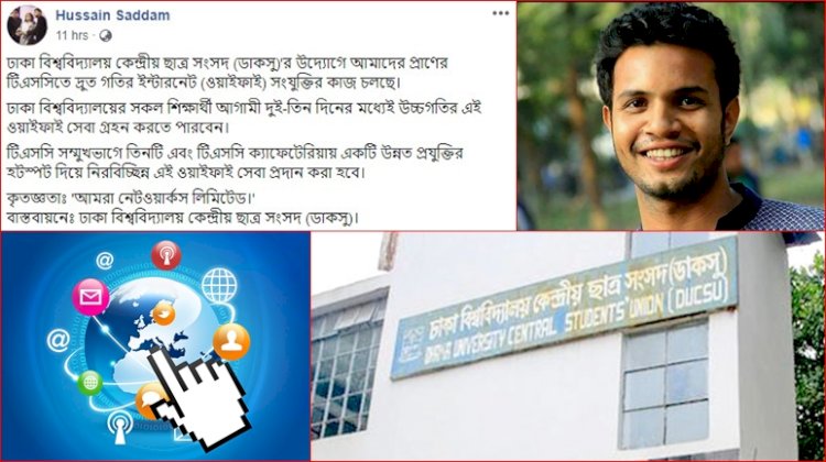 ঢাকা বিশ্ববিদ্যালয় কেন্দ্রীয় ছাত্র সংসদ (ডাকসু)'র উদ্যোগে আগামী সপ্তাহ থেকে দ্রুত গতির ইন্টারনেট সেবার আওতায় আসছে টিএসসি। এবিষয়ে ডাকসুর এজিএস ও ঢাবি ছাত্রলীগের সাধারণ সম্পাদক সাদ্দাম হোসেন মঙ্গলবার রাতে সামাজিক যোগাযোগ মাধ্যম ফেসবুকে একটি স্ট্যাটাস দিয়েছেন। আমাদের কাগজ পাঠকদের জন্য তা হুবহু তুলে ধরা হলো-