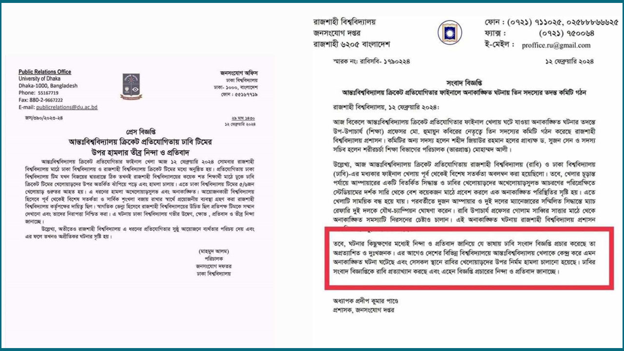 রাজশাহী বিশ্ববিদ্যালয়ে (রাবি) আন্তঃবিশ্ববিদ্যালয় ক্রিকেট প্রতিযোগিতার ফাইনাল ম্যাচে ঘটে যাওয়া অনাকাঙ্ক্ষিত ঘটনার প্রেক্ষিতে ঢাকা বিশ্ববিদ্যালয় (ঢাবি) প্রশাসনের পক্ষ থেকে দেওয়া সংবাদ বিজ্ঞপ্তি প্রত্যাখ্যান করেছে রাবি প্রশাসন।