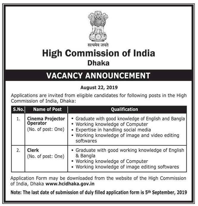 ভারতীয় হাইকমিশন ঢাকায় বিভিন্ন পদে নিয়োগের জন্য বিজ্ঞপ্তি প্রকাশ করেছে।