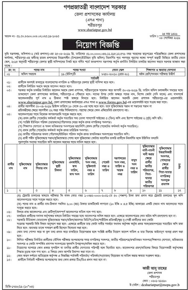 আবেদনপত্র http://www.shariatpur.gov.bd ও http://www.forms.gov.bd ওয়েবসাইটে পাওয়া যাবে।