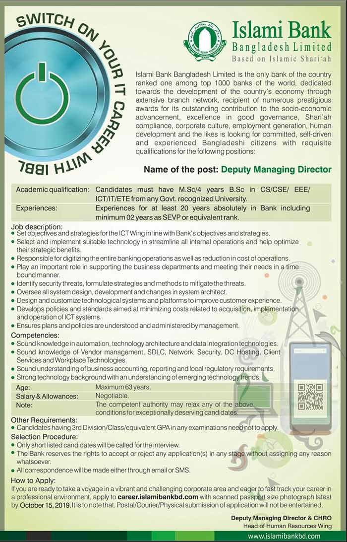ইসলামী ব্যাংক বাংলাদেশ লিমিটেড নিম্নলিখিত পদে নিয়োগে জন্য যোগ্যতাসম্পন্ন প্রার্থীদের থেকে দরখাস্ত আহ্বান করেছে।