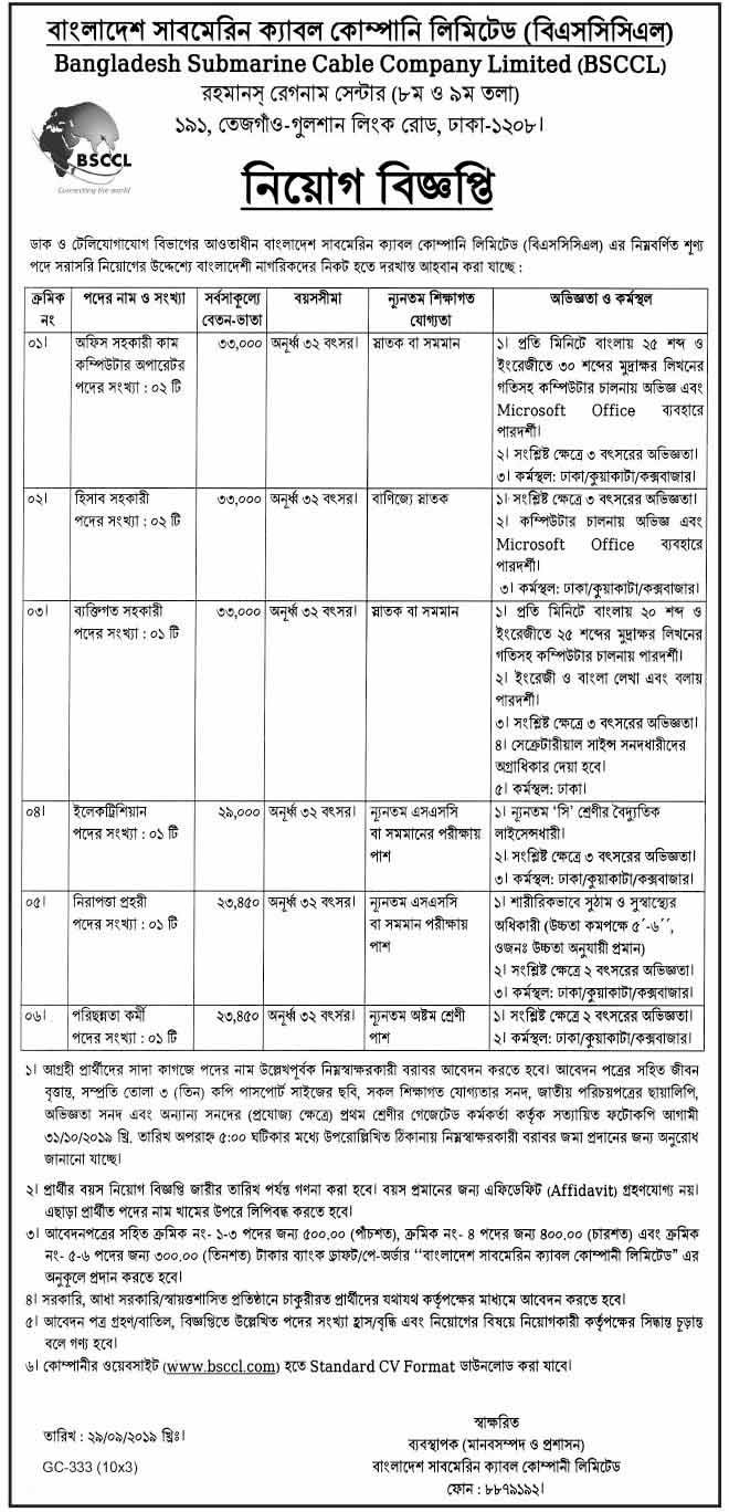 ডাক ও টেলিযোগাযোগ বিভাগের আওতাধীন বাংলাদেশ সাবমেরিন ক্যাবল কোম্পানি লিমিটেড (বিএসসিসিএল) এর শূন্য পদে নিয়োগের জন্য বাংলাদেশি নাগরিকদের থেকে দরখাস্ত আহ্বান করেছে।