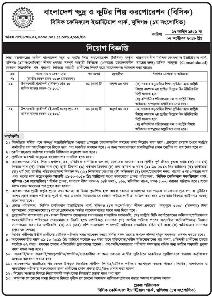 বাংলাদেশ ক্ষুদ্র ও কুটির শিল্প করপােরেশনের (বিসিক) বাস্তবায়নাধীন 'বিসিক কেমিক্যাল ইন্ডাস্ট্রিয়াল পার্ক, মুন্সিগঞ্জ (১ম সংশােধিত)’ শীর্ষক প্রকল্পে কর্মকর্তা নিয়োগ দেয়া হবে।