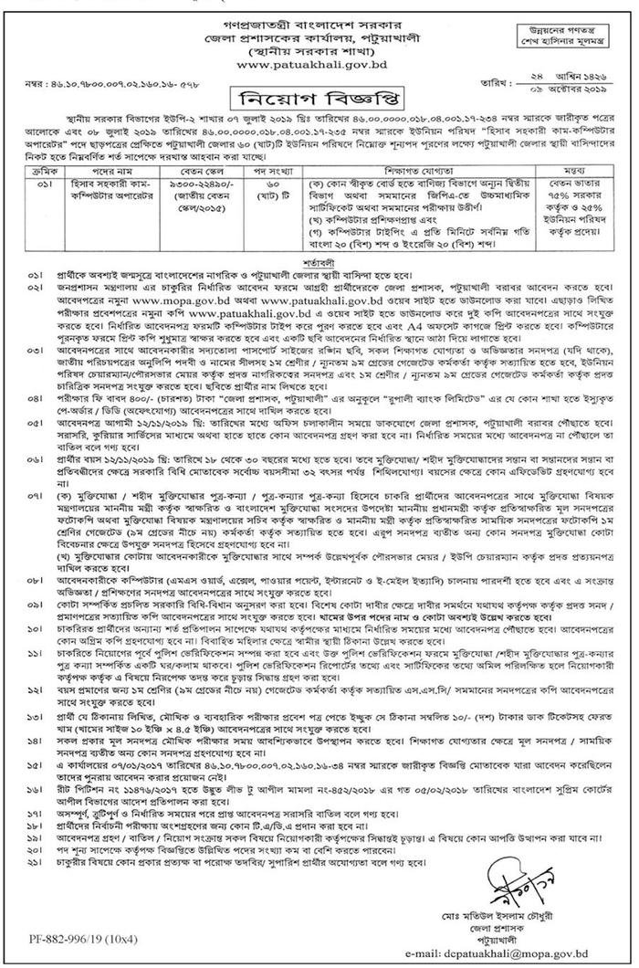 পটুয়াখালী জেলা প্রশাসকের কার্যালয়ের অধীন ইউনিয়ন পরিষদে শূন্যপদে লােকবল নিয়ােগ দেয়া হবে। পটুয়াখালী জেলার স্থায়ী বাসিন্দারা পদগুলোতে আবেদন করতে পারবেন।