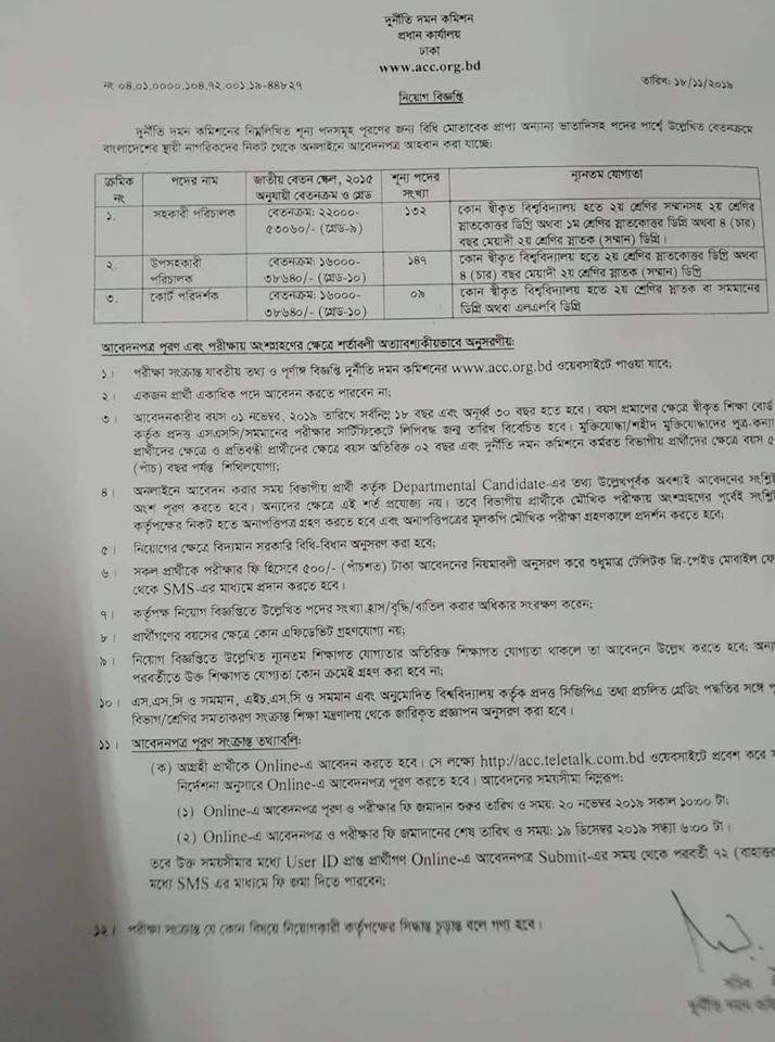 দুর্নীতি দমন কমিশনের নিম্নলিখিত শূন্যপদ পূরণের জন্য বিধি মোতাবেক প্রাপ্য অন্যান্য ভাতাদিসহ পদের পার্শ্বে উল্লেখিত বেতনক্রমে বাংলাদেশের স্থানীয় নাগরিকদের নিকট থেকে অনলাইনে আবেদনপত্র আহবান করা যাচ্ছে: