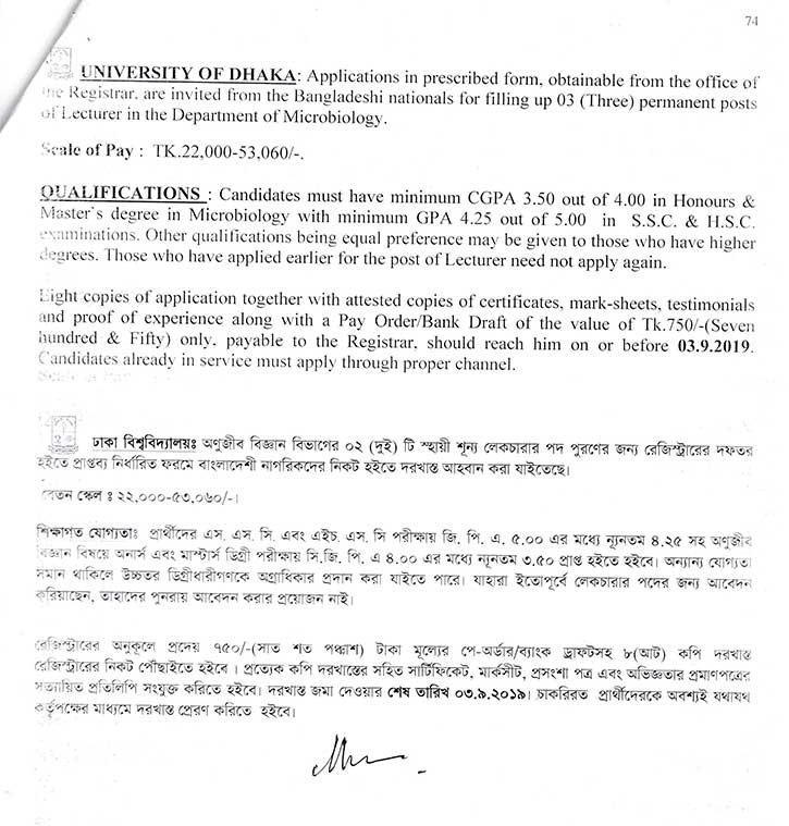 ঢাকা বিশ্ববিদ্যালয় অনুজীব বিজ্ঞান বিভাগে প্রভাষক নিয়োগের জন্য যোগ্যতাসম্পন্ন বাংলাদেশি নাগরিকদের থেকে দরখাস্ত আহ্বান করেছে।