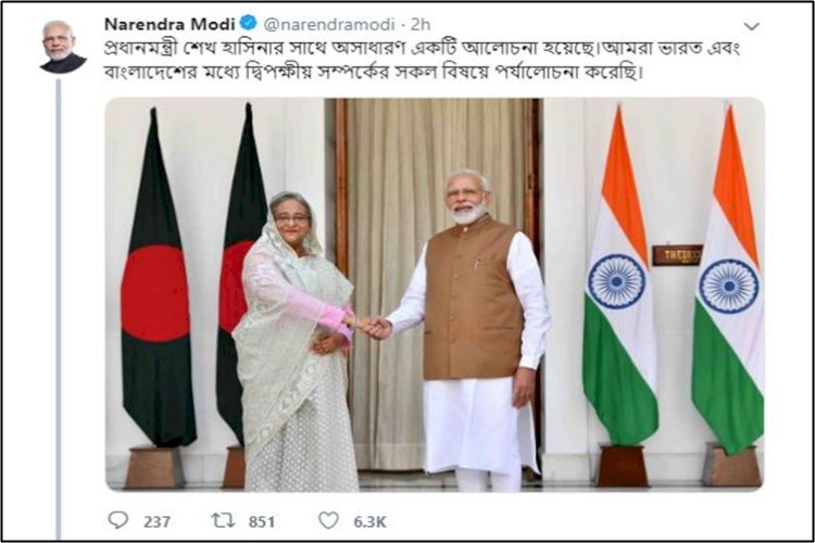 ভারতে সফররত প্রধানমন্ত্রী শেখ হাসিনার সঙ্গে দ্বিপক্ষীয় বৈঠক প্রসঙ্গে একাধিক টুইট করেন ভারতের প্রধানমন্ত্রী নরেন্দ্র মোদি।