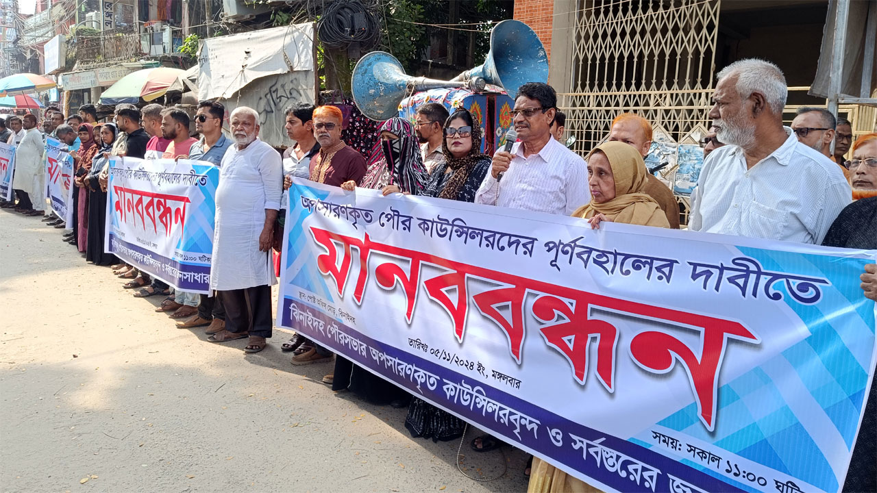 ঝিনাইদহে অপসারণকৃত পৌর কাউন্সিলরদের পুনর্বহালের দাবিতে মানববন্ধন কর্মসূচি পালিত হয়েছে। গতকাল শহরের পোস্ট অফিস মোড়ে বাংলাদেশ পৌর কাউন্সিলর অ্যাসোসিয়েশনের ব্যানারে এ কর্মসূচি পালিত হয়। এতে ঝিনাইদহের ৬টি পৌরসভার কাউন্সিলর, পৌরসভার বাসিন্দাসহ নানা শ্রেণি-পেশার মানুষ অংশ নেয়।