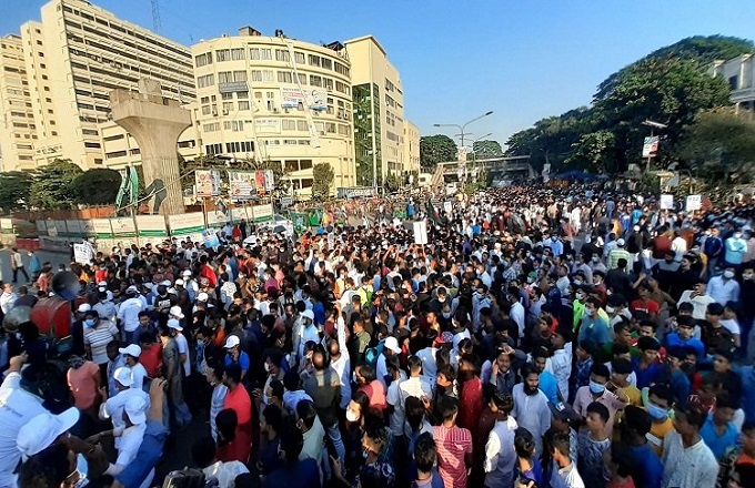 পরে শাহবাগ মোড়ের রাস্তা আটকে গণজমায়েত শুরু করেন তাঁরা। একটি মিনি ট্রাকের ওপর মঞ্চ স্থাপন করে নেতারা বক্তব্য দেন। সমাবেশে অন্যান্যের মধ্য উপস্থিত আছেন মঞ্চের কেন্দ্রীয় সভাপতি আমিনুল ইসলাম বুলবুল, সাধারণ সাধারণ সম্পাদক আল মামুন, ঢাকা বিশ্ববিদ্যালয় শাখার সভাপতি সনেট মাহমুদ ও সাধারণ সম্পাদক ইয়াসির আরাফাত৷