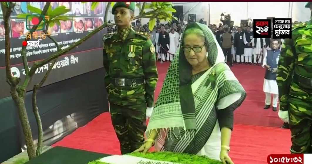 ১০টা ৫৮ মিনিটে প্রথমে প্রধানমন্ত্রী হিসেবে শ্রদ্ধা নিবেদন করেন শেখ হাসিনা। এরপর আওয়ামী লীগ সভাপতি হিসেবে শ্রদ্ধা নিবেদন করেন। তার আহতদের সঙ্গে কথা বলেন প্রধানমন্ত্রী।