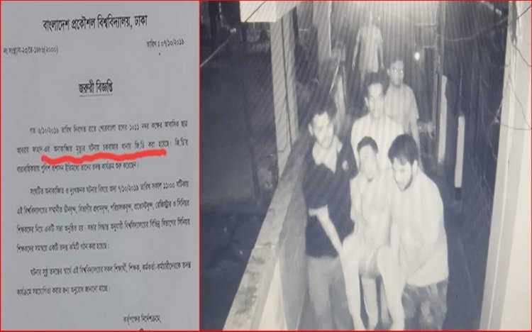 বিজ্ঞপ্তিতে বলা হয়, ৬ তারিখ দিবাগত রাতে শেরে বাংলা হলের ১০১১ নম্বর কক্ষের আবাসিক ছাত্র আবরার ফাহাদের অনাকাঙ্ক্ষিত মৃত্যুর ঘটনায় জিডি করা হয়েছে। জিডির ধারাবাহিকতায় পুলিশ প্রশাসন ইতিমধ্যে তাদের কার্যক্রম শুরু করেছেন। সংঘটিত অনাকাঙ্ক্ষিত ও দুঃখজনক ঘটনার বিষয়ে সোমবার সকাল ১১ টায় বিশ্ববিদ্যালয়ের ডিনবৃন্দ, বিভাগীয় প্রধানবৃন্দ, পরিচালকবৃন্দ, প্রভোস্টবৃন্দ, রেজিস্টার ও সিনিয়রদের নিয়ে অনুষ্ঠিত সভায় একটি তদন্ত কমিটি গঠন করা হয়েছে।